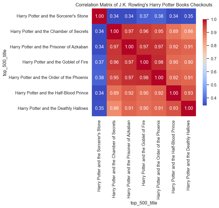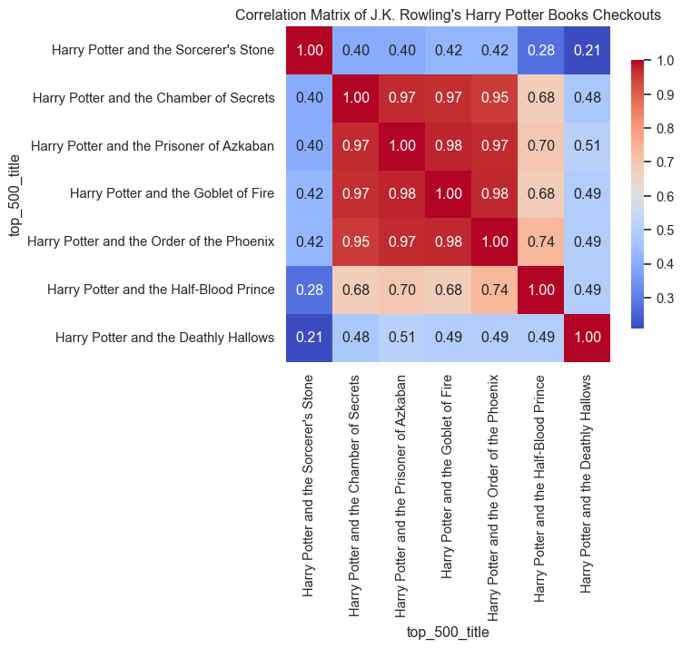 plt.title("Correlation Matrix of J.K. Rowling's Harry Potter Books Checkouts")