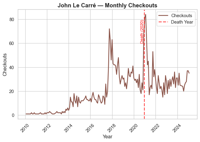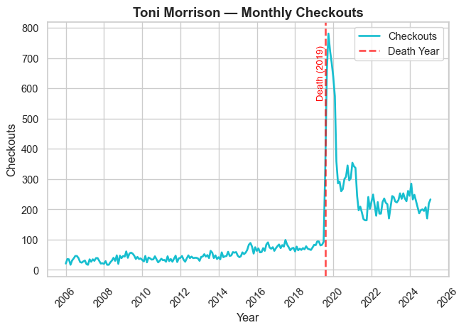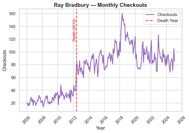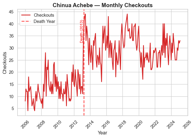 The library checkout data comes from the city of Seattle. The Seattle Public Library’s (SPL) open checkout data is one of the only publicly available sources of book reception data in the country (Gupta, Christensen, et al. 2025; Walsh 2022). The dataset presented here is a combination of both the Top 500 “Greatest” Novels and a mirrored version of the SPL’s open checkout data, recording checkouts from 2005 until February 2025.