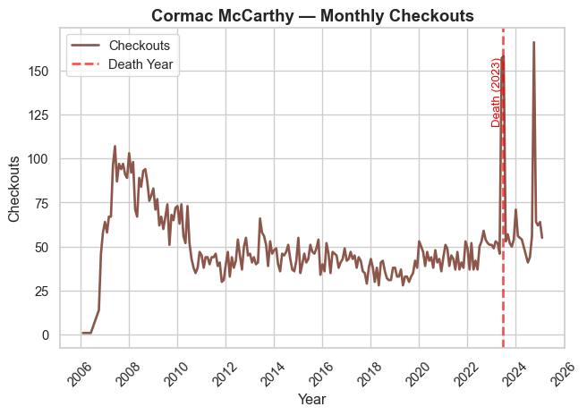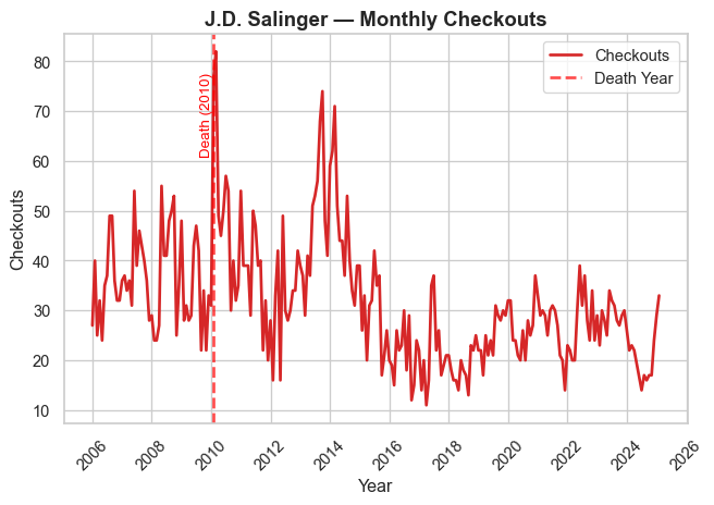 These have a more obvious explanation. Both these books were released in the last 20 years, so they have large numbers of checkouts following their actual release. This follows what we know about how books function commercially, where a large share of their sales come immediately around their release (Sorensen 2007).